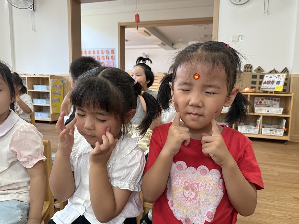 随后的“眼睛手指游戏”更是让教室里充满欢声笑语。老师带领宝贝们一边念口诀“小眼睛,亮晶晶,看老师,眨一眨”,一边用手指模仿眼睛“睁开”“闭上”“看左看右”的动作。简单的游戏不仅锻炼了宝贝们的眼部协调性,还让他们在玩乐中记住了“不揉眼睛、勤眨眼睛”的小常识。