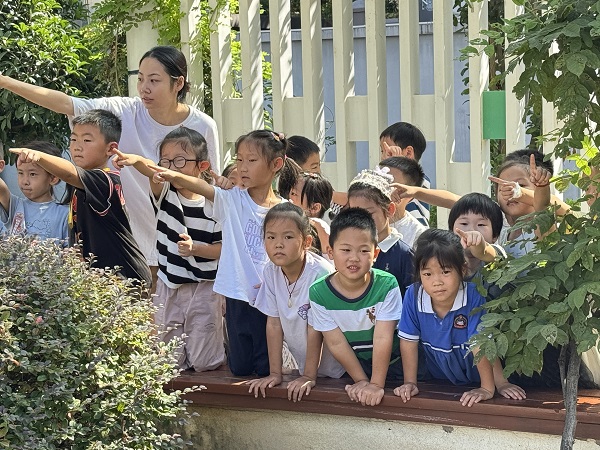 天气晴朗时,老师会带孩子们到户外开展“护眼小任务”:先看看远处的大树,感受“绿色护眼”的舒适让眼睛“放松休息”。