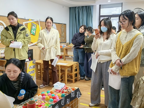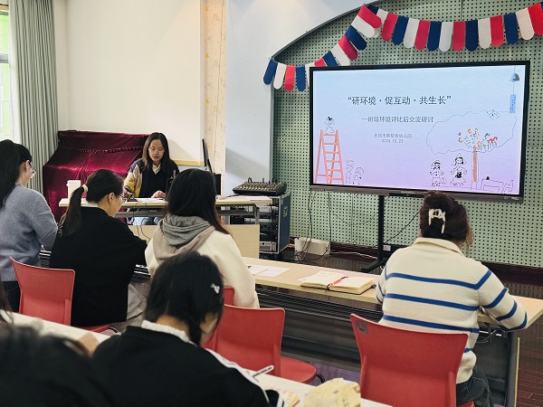 观摩结束后,全体教师围绕“班本化环境创设”展开深度研讨,从区域规划的目的性、材料投放的适宜性、幼儿参与的实质性等角度,共同探讨如何进一步提升环境的教育功能,使其真正成为支持幼儿主动探索与发展的“第三位教师”。