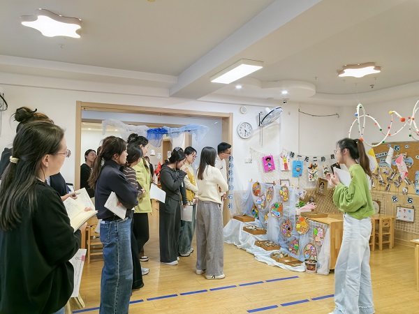 活动以“走现场、听讲解、聚点评”的形式展开,参与教师从空间规划、主题墙面、区域材料投放、自然角与种植园地等多个维度,全面审视环境对幼儿发展的实际支持作用。各班教师作为“环境讲解员”,从幼儿兴趣与发展需求出发,系统阐述环境创设背后的课程逻辑与儿童参与轨迹,生动呈现了环境作为“隐性课程”的教育价值。