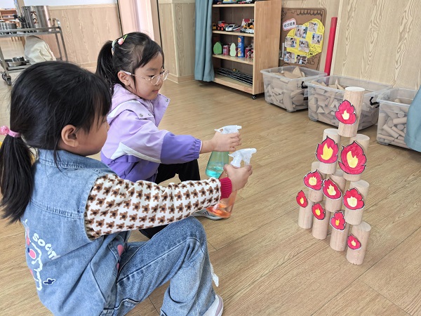 活动注重将消防知识自然融入幼儿的日常学习与游戏。前期,孩子们在家庭与幼儿园的联合引导下,扮演“小小安全观察员”,主动识别身边的消防设施与潜在隐患。各班级通过故事、动画、情景模拟等多种生动形式,系统讲解火灾预防、正确报警及逃生自救知识,重点练习了“弯腰低姿、湿毛巾捂口鼻”等关键逃生技能。在趣味游戏环节,孩子们通过模拟穿越“火线”、扮演“小小消防员”体验灭火过程,在亲身体验中将抽象的消防安全知识转化为深刻记忆。
