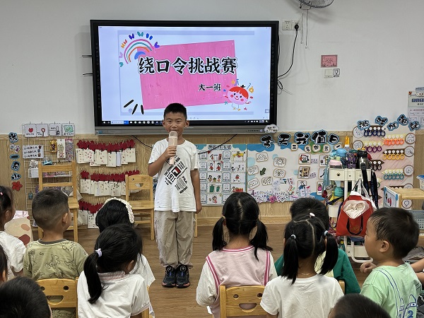 大班的哥哥姐姐们,则化身推普“小领航员”,用更丰富的形式传递推普理念。“绕口令挑战赛”上,孩子们口齿清晰、字正腔圆。